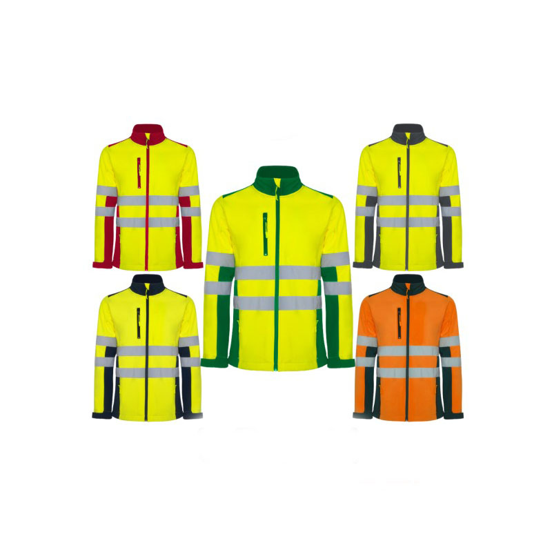 High visibility two-tone soft shell with reflective bands on the chest and sleeve, high collar, central zip, Velcro fastening on the cuffs, internal elasticated waistband with drawstring fastening, three external pockets and two internal pockets.