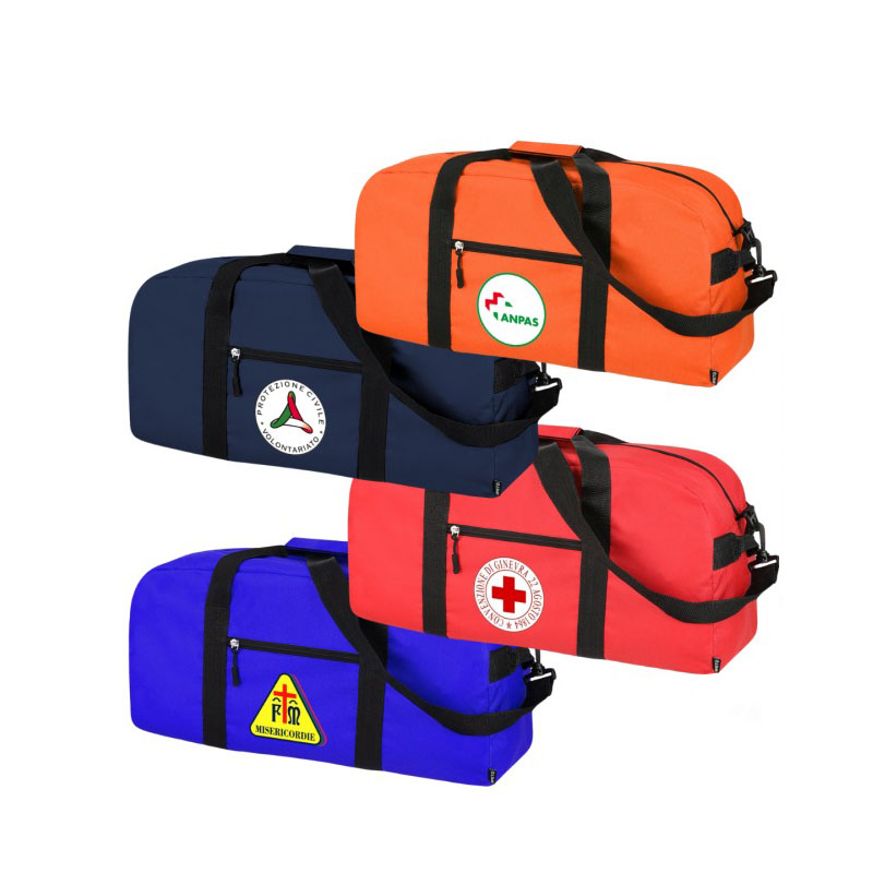 Personalized duffel bag for civil protection, Red Cross, ANPAS and Misericordie volunteers, made of durable 600D RPET polyester.