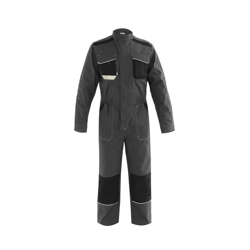 Multi-season stretch canvas work overalls with a mandarin collar and Velcro closure and a covered plastic zipper closure.